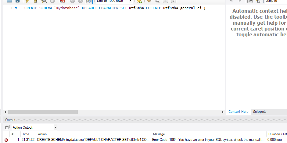 그럼 0 4 21:31:56 CREATE SCHEMA 'mydatabase' DEFAULT CHARACTER SET utf8mb4 COLLATE utf8mb4_general_ci Error Code: 1064. You have an error in your SQL syntax; check the manual that corresponds to your MySQL server version for the right syntax to use near ''mydatabase' DEFAULT CHARACTER SET utf8mb4 COLLATE utf8mb4_general_ci' at line 1 0.000 sec 에러가 뜰 것 이다.